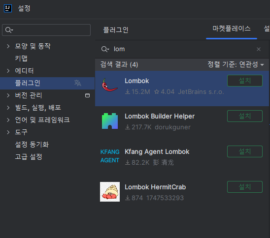 - 셋팅 - 플러그인 에 Lombok 검색 후 설치