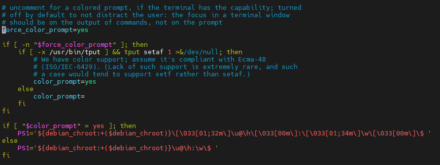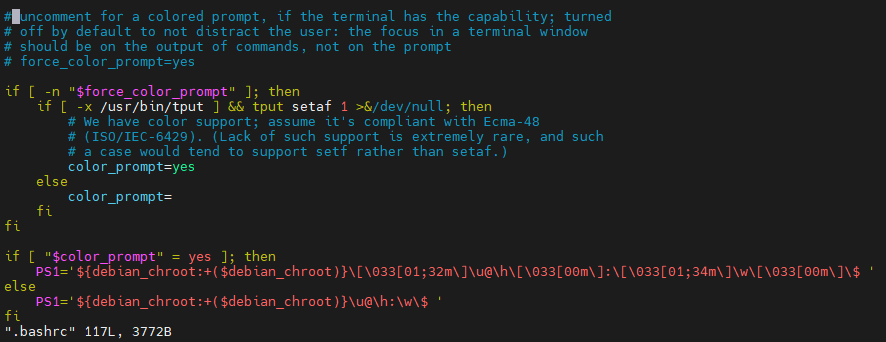 force_color_prompt=yes 부분의 주석을 제거 후 wq하여 vi를 빠져나옵니다.
