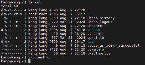 force_color_prompt=yes 부분의 주석을 제거 후 wq하여 vi를 빠져나옵니다.