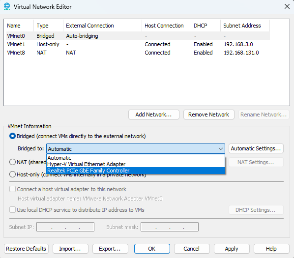 VMnet0이 생긴다. 그리고 밑에 자기가 쓰던 이더넷 카드를 찾아서