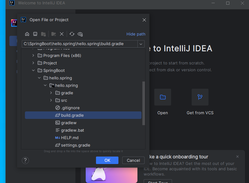 인텔리제이를 키고 Open을 하고 hello.spring 폴더를 찾아 bulid.gradle을 찾아 OK누르면