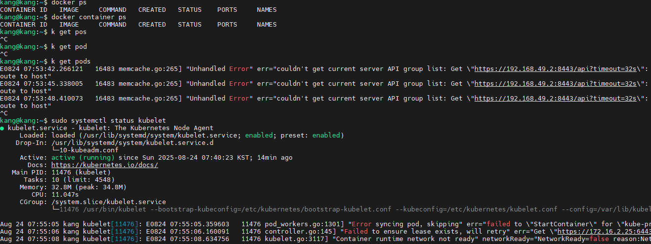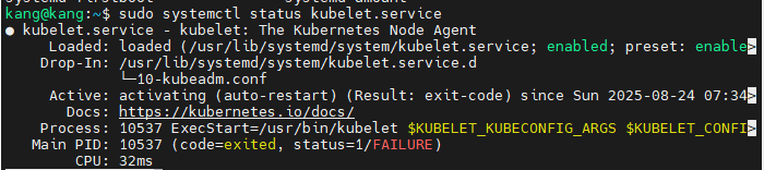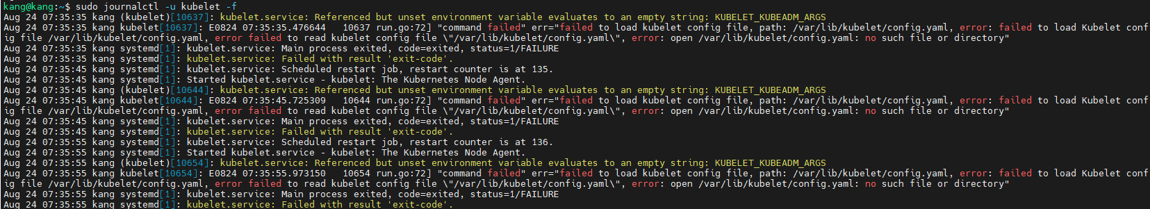 그래서 혹시나 k get pods 해보니 해당 오류가 발생했고 kubelet 상태는 active로 돌아가는중