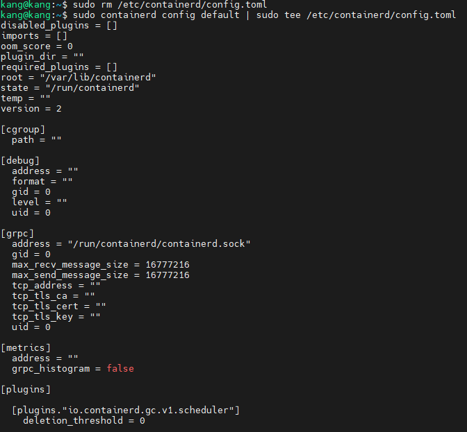 sudo containerd config default | sudo tee /etc/containerd/config.toml
