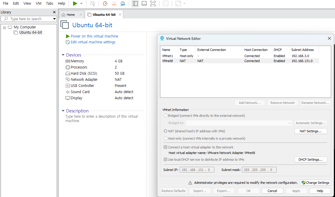 edit -> Virtual Network Editor -> Change Settings 을 눌러 수정이 가능하게 변경 후