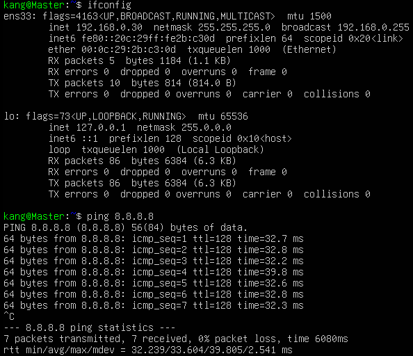 ifconfig로 IP변경이 잘되었는지 잘되었으면 8.8.8.8로 ping 날려 통신이 잘되는 확인 하면됨