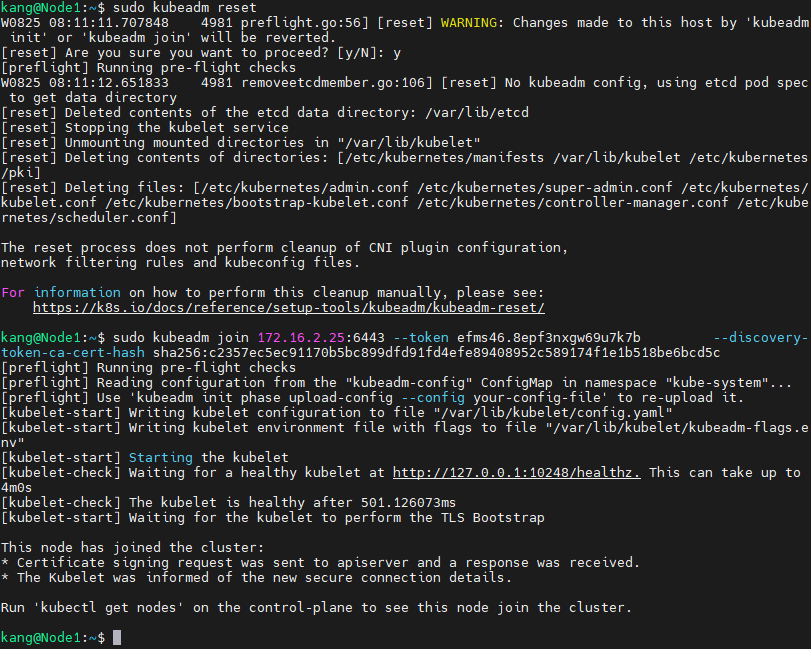 - 워커 노드에 있는 adm 정보를 리셋시킴