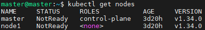 kubectl get nodes 명령어 결과에서 노드의 STATUS가 Not Ready 상태로 표시되는 경우는 노드가 정상적으로 클러스터와 통신하거나 동작하지 못하는 상태이므로 CNI를 설치하여 클러스터와 노드가 정상적으로 통신 되게 해야함