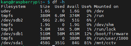 확인 해보면 /dev/sda1 : /mnt/cctv 가 마운트 된걸 확인 할 수 있음