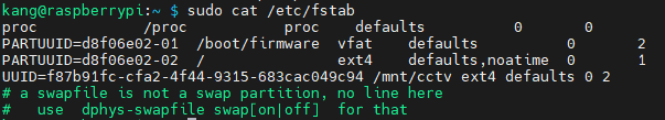 UUID=f87b91fc-cfa2-4f44-9315-683cac049c94 /mnt/cctv ext4 defaults 0 2